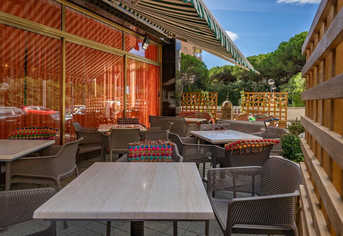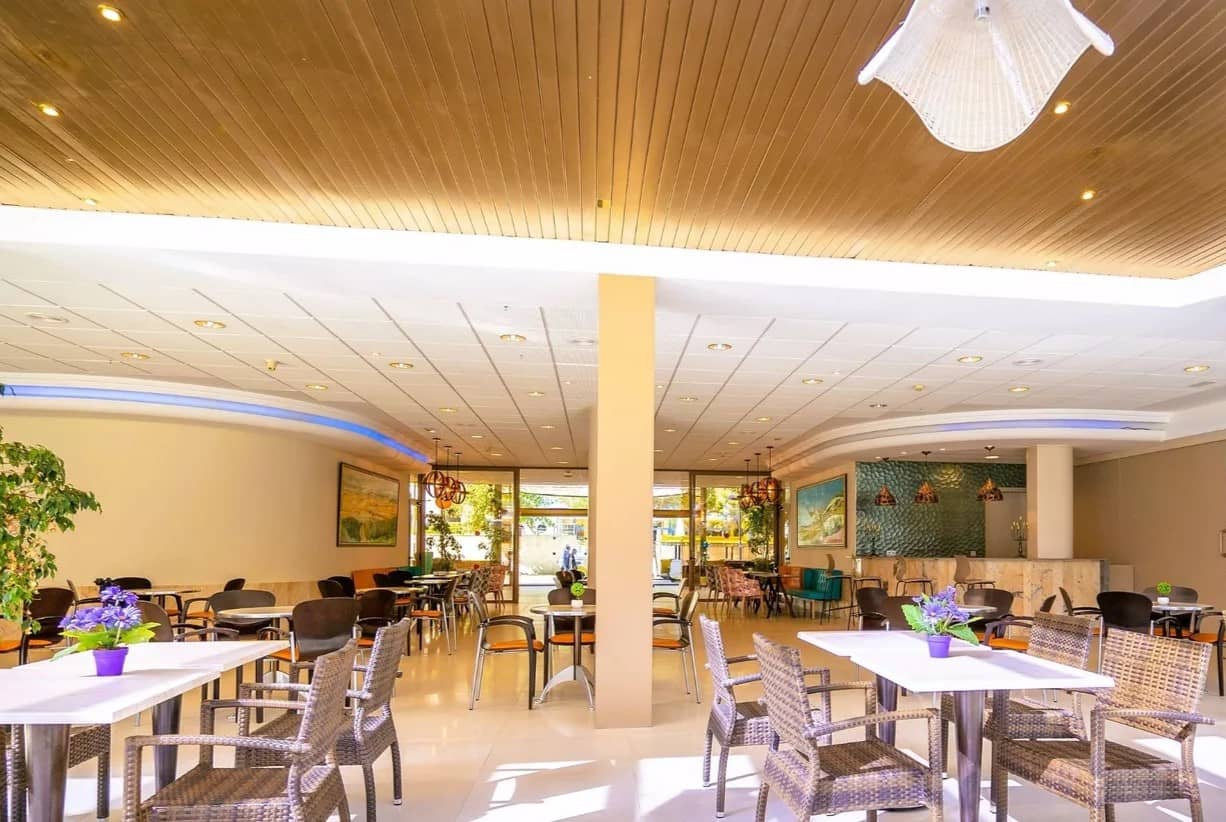 Le restaurant Aquamarina, situé au premier étage, propose une cuisine méditerranéenne et internationale sous forme de buffet, avec des dîners à thème organisés plusieurs fois par semaine. Un bar-salon avec terrasse extérieure est également disponible pour savourer une boisson dans une ambiance détendue.