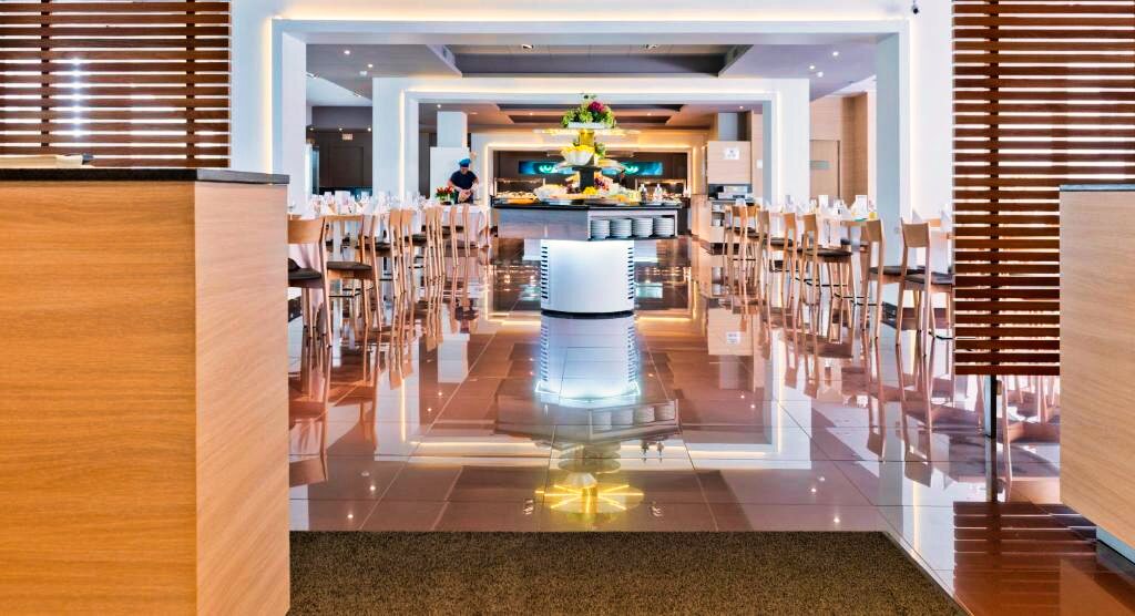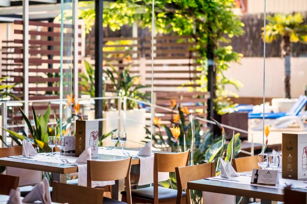Le restaurant principal de l’hôtel propose un service buffet varié, alliant cuisine méditerranéenne et internationale, élaborée à partir de produits frais et locaux. Des soirées à thème et des dîners spéciaux sont régulièrement organisés. Des plats végétariens et sans gluten sont disponibles sur demande. L’hôtel offre plusieurs formules selon les envies : petit-déjeuner, demi-pension ou pension complète. Un bar moderne et un espace lounge complètent l’offre, parfaits pour savourer un cocktail face à la mer dans une ambiance décontractée.