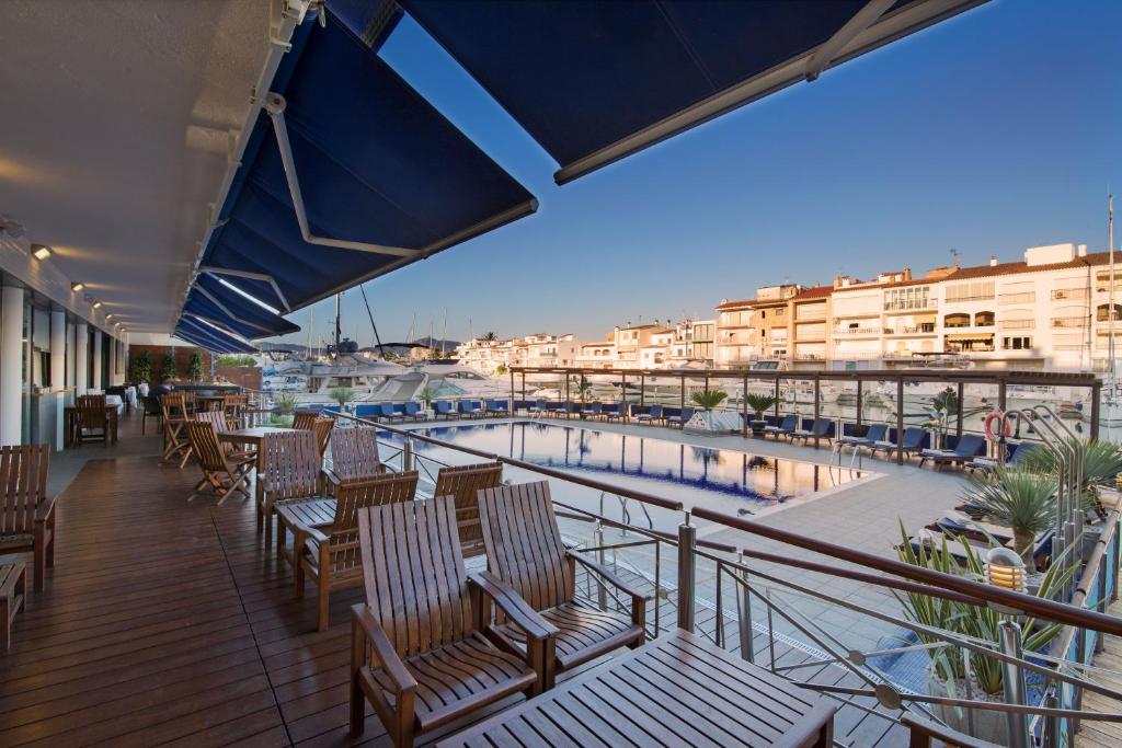 L’aéroport de Gérone – Costa Brava se situe à environ 60 kilomètres et celui de Barcelone – El Prat à environ 170 kilomètres. La gare la plus proche est celle de Figueres, à environ 15 kilomètres, avec des liaisons régulières en bus vers Empuriabrava. L’accès en voiture est facile via l’autoroute AP-7 et la route C-260, avec stationnement possible directement à l’hôtel.