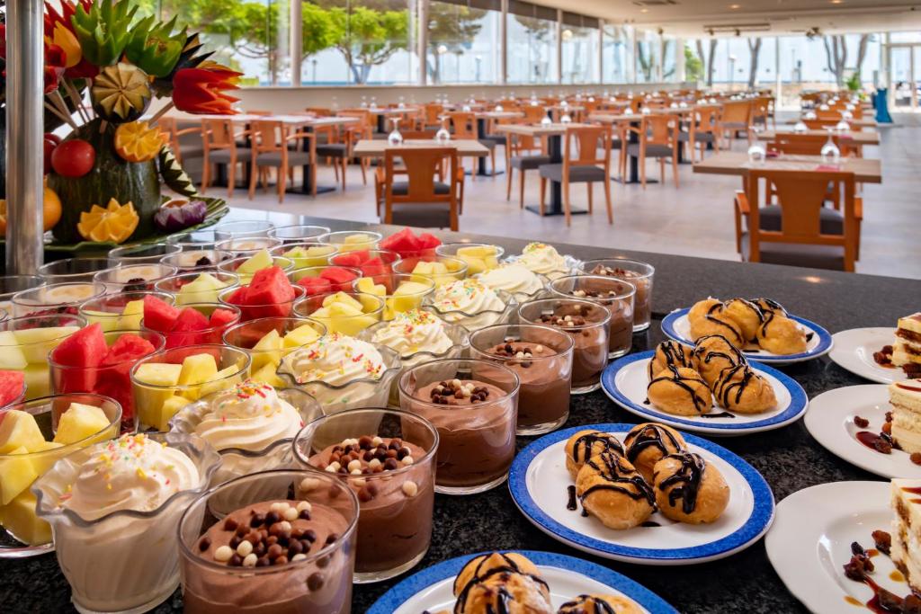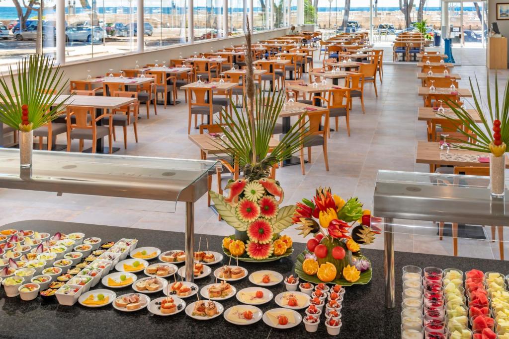 Le restaurant buffet de l’hôtel propose une cuisine méditerranéenne et internationale, avec un large choix de plats et de produits frais. Le show-cooking et les soirées à thème ajoutent une touche de convivialité. Des options végétariennes et sans gluten sont disponibles sur demande. Plusieurs formules sont proposées selon vos envies : petit-déjeuner, demi-pension, pension complète ou tout compris. L’hôtel dispose également d’un bar-cafétéria et d’un bar en terrasse avec vue sur la mer, idéal pour un moment de détente à toute heure de la journée.