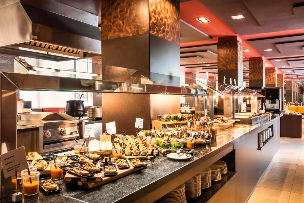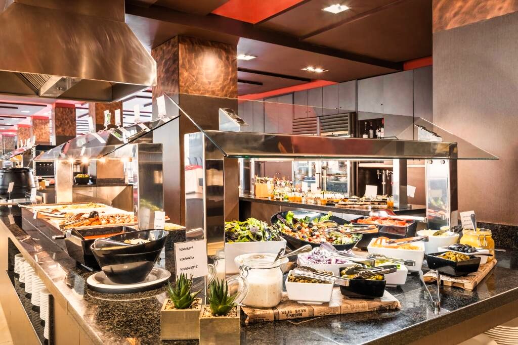 Le restaurant de l’hôtel propose une restauration sous forme de buffet varié, mêlant cuisine méditerranéenne et internationale, avec des options adaptées aux régimes particuliers telles que des alternatives végétariennes ou sans gluten sur demande. Les formules disponibles incluent le petit-déjeuner, la demi-pension et la pension complète.