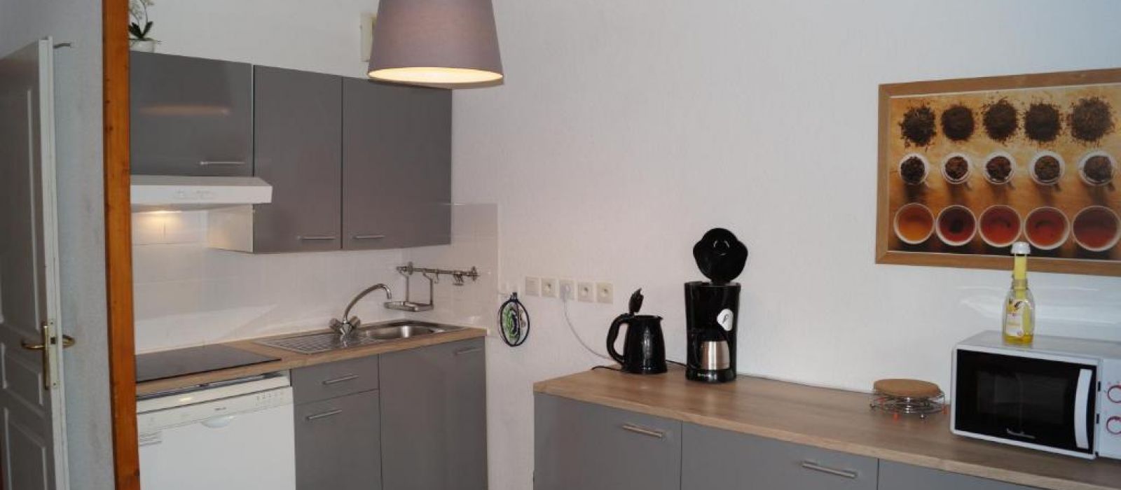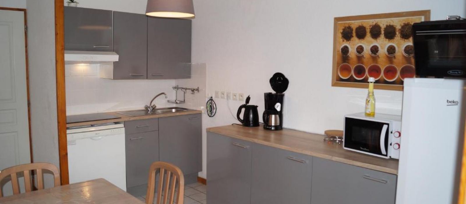 La cuisine entièrement équipée comprend un coin repas, un lave-vaisselle, un réfrigérateur et une cuisinière, ainsi que des ustensiles de cuisine et un four.