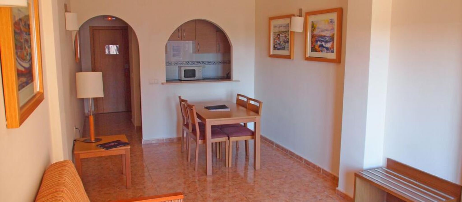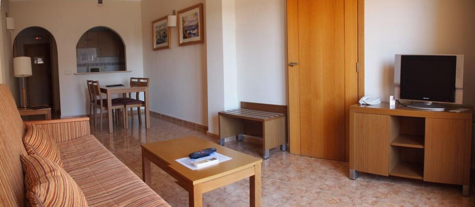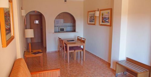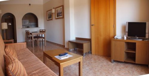 Le coin salon du Costa Narejos comprend des fauteuils confortables et une grande télévision, qui diffuse souvent des programmes sportifs. La piscine est entourée d'une terrasse bien exposée et de chaises longues.