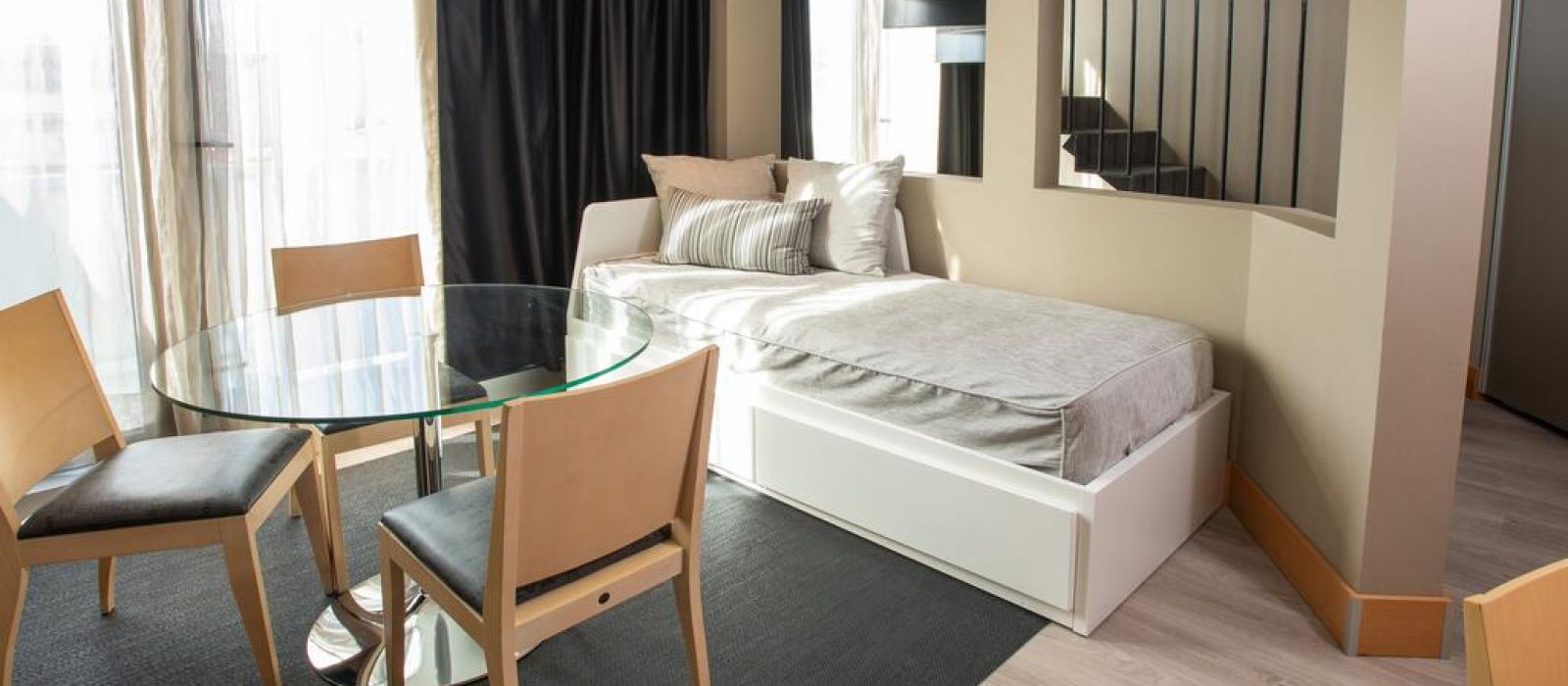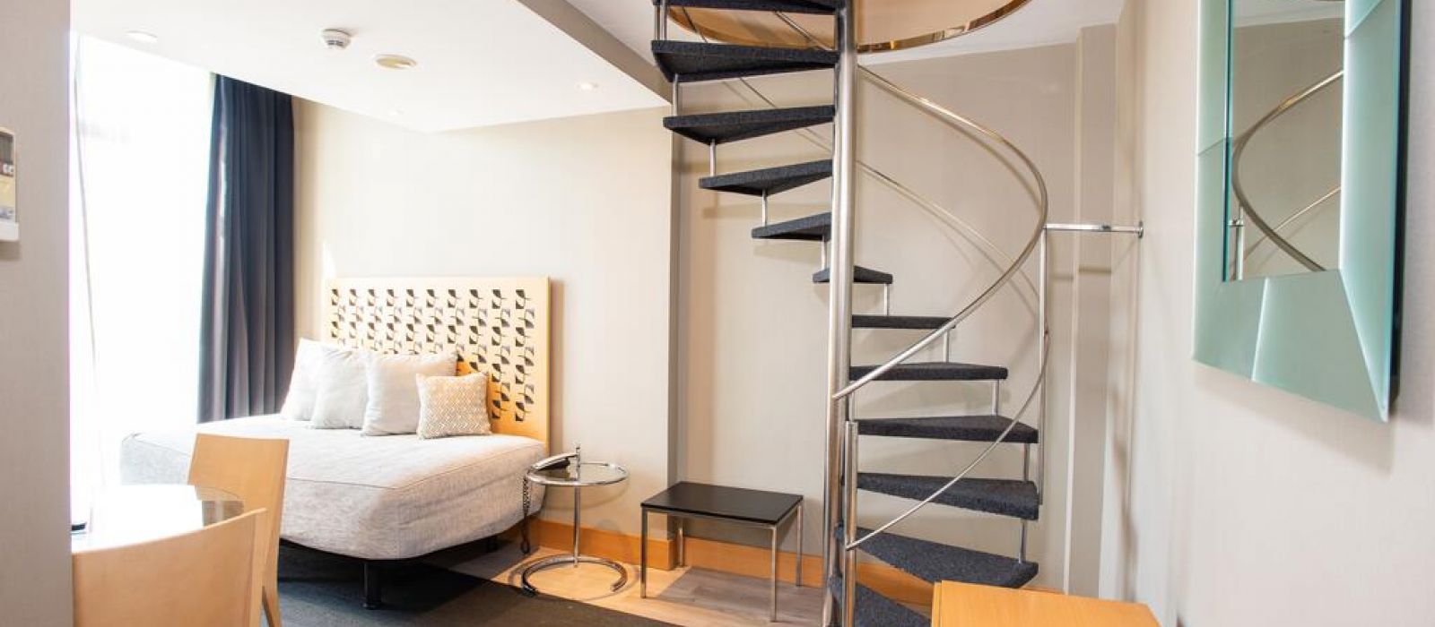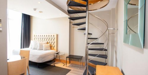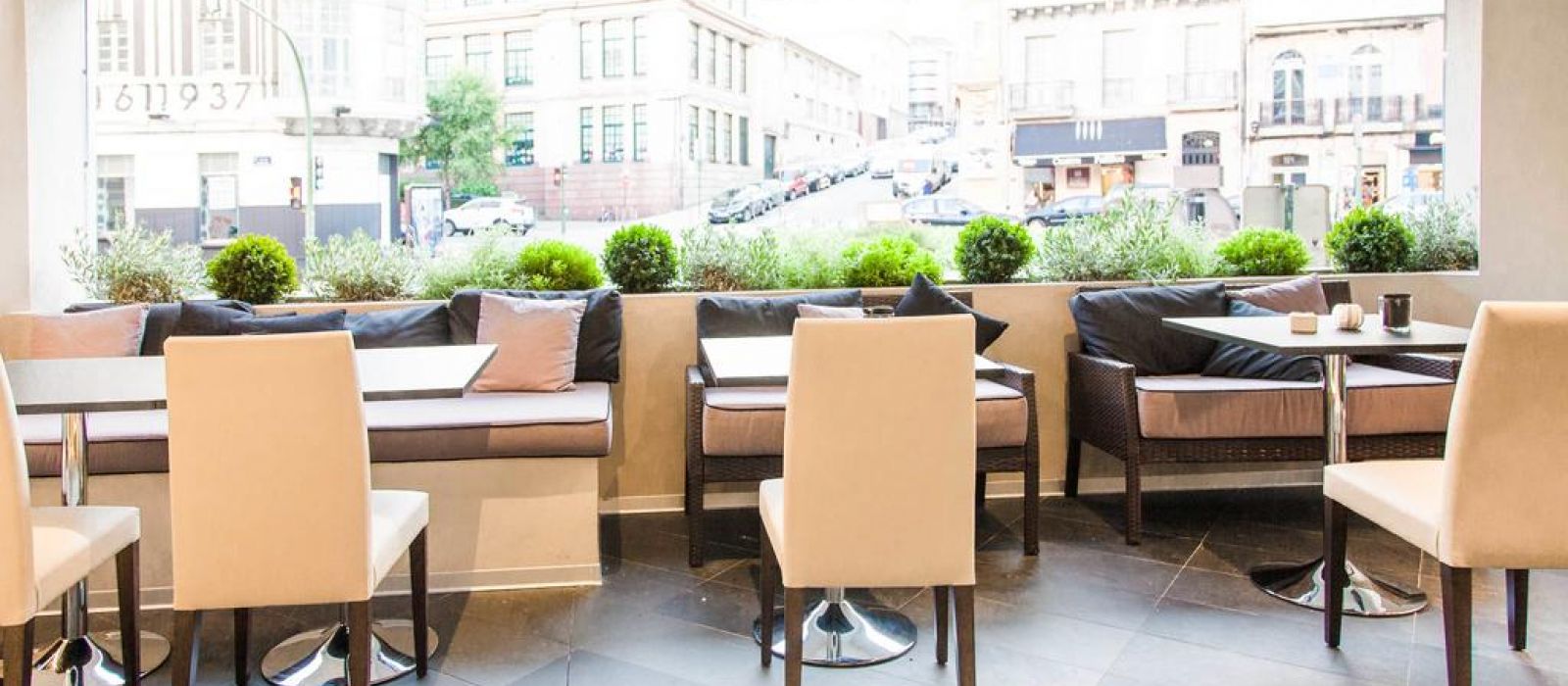 Les intérieurs de l'hôtel Plaza sont modernes et minimalistes, mettant l'accent sur des bois clairs et des accessoires chromés. Les chambres sont baignées de lumière naturelle grâce à leurs grandes fenêtres.