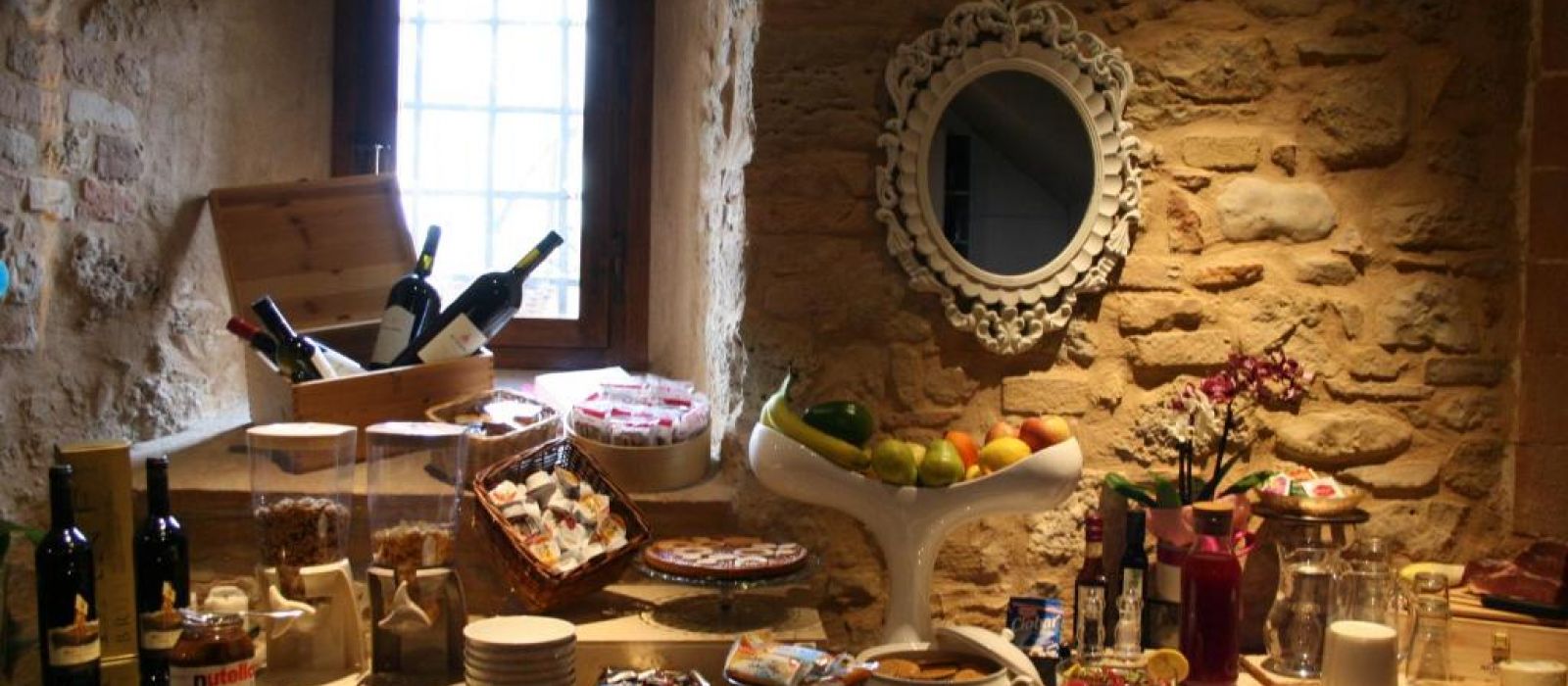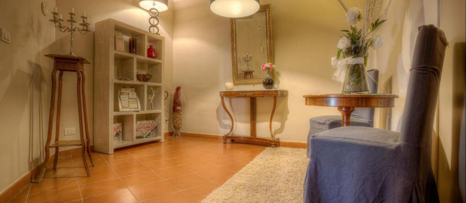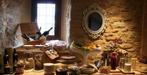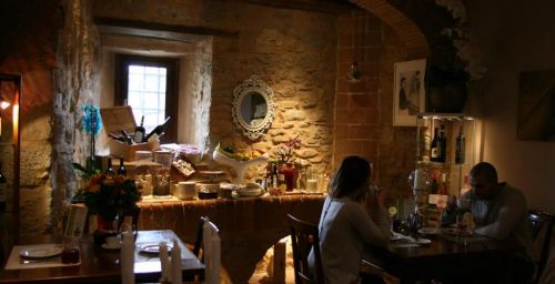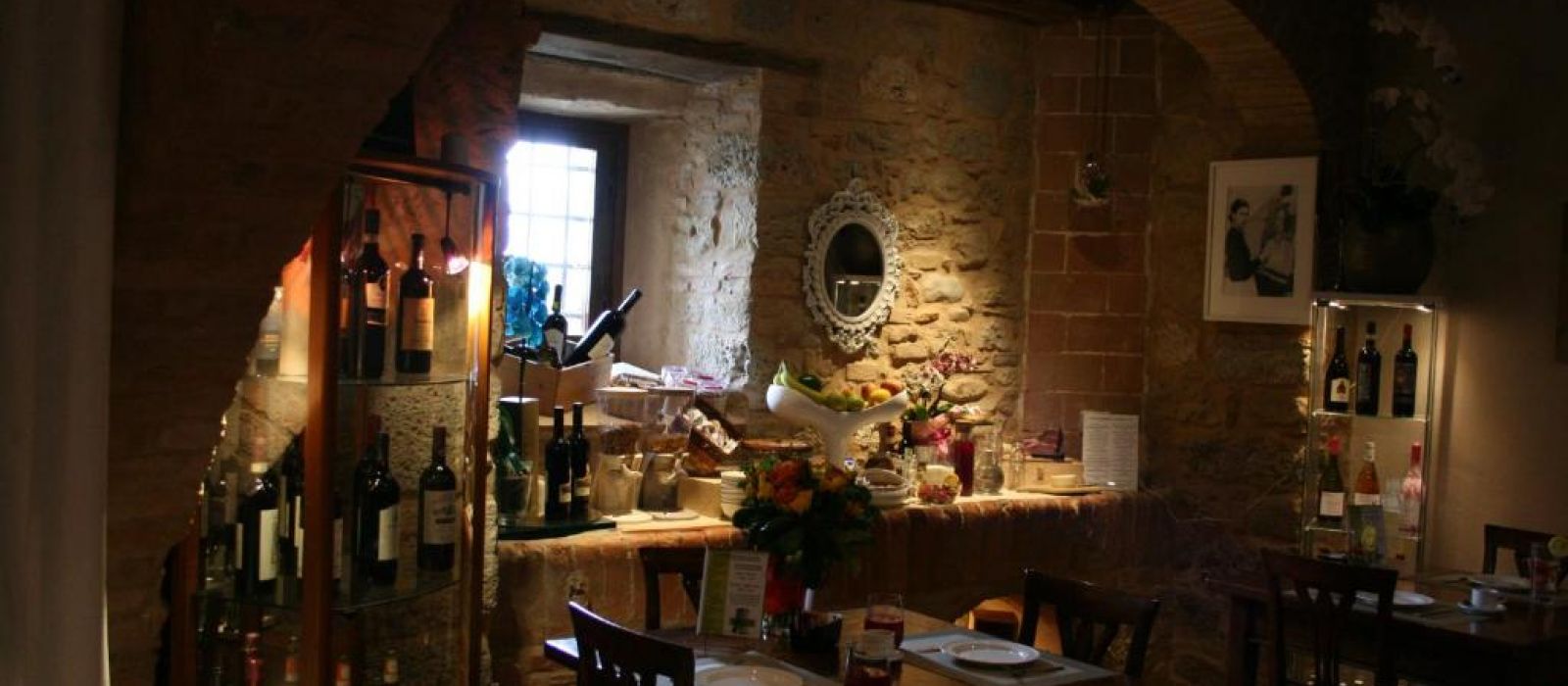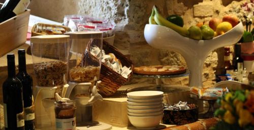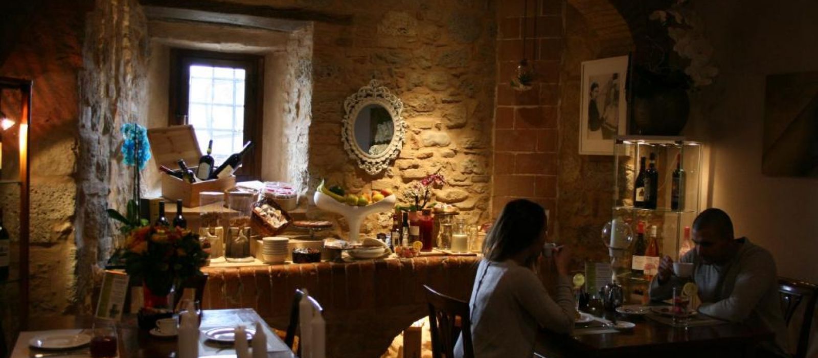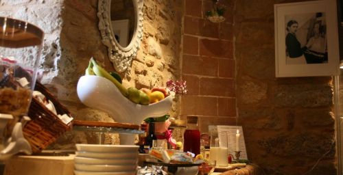 Le deuxième étage du Torre dei Serviti comprend un salon avec cheminée, un bar et une petite terrasse panoramique. Le petit-déjeuner buffet est servi dans une salle à manger lumineuse.