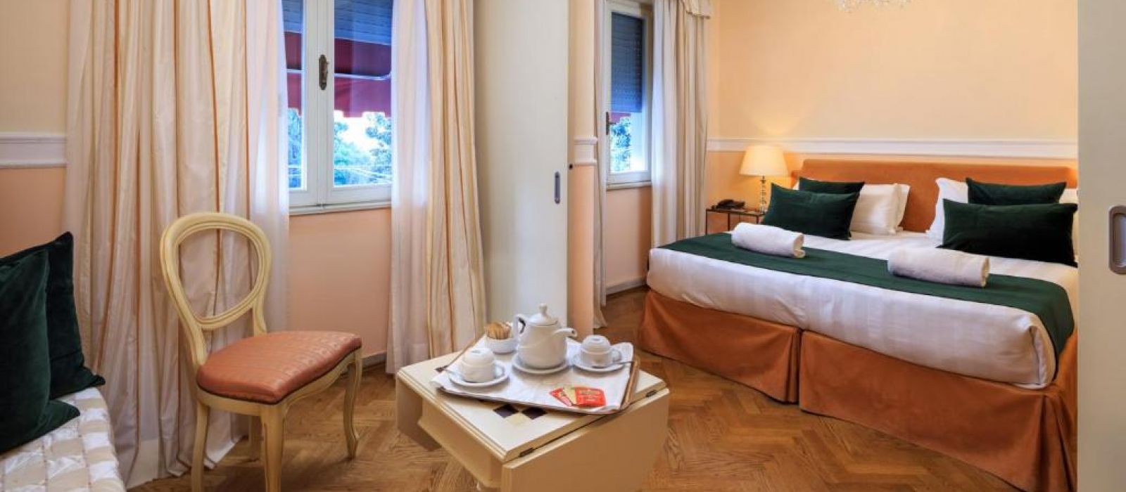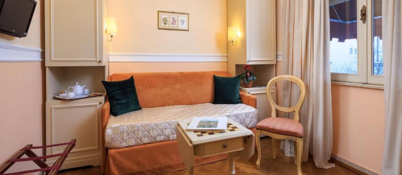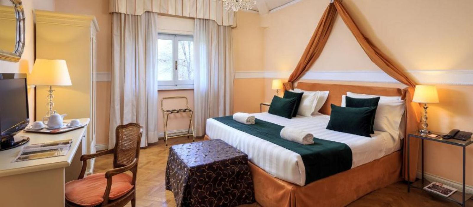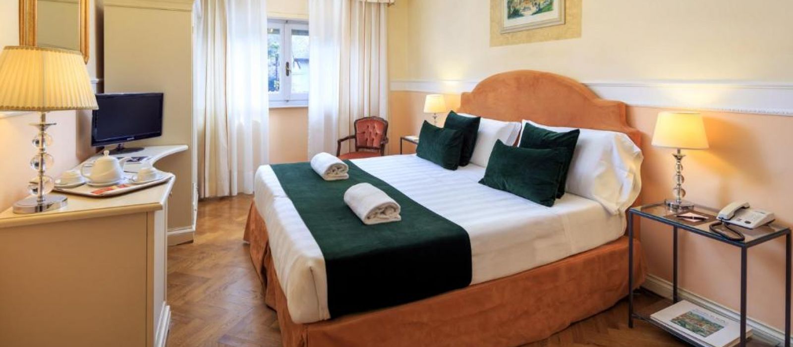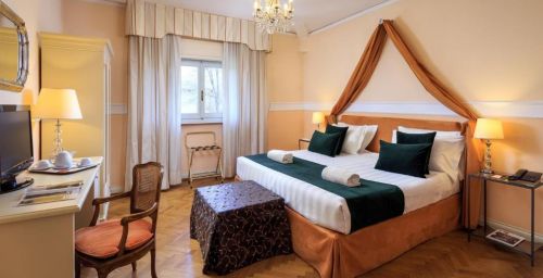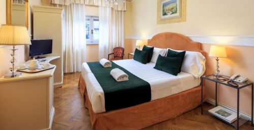 Chaque chambre de l'Hotel Villa Carlotta est équipée de la climatisation, d'une télévision par satellite et de parquet élégant. Toutes sont décorées dans un style classique avec des lustres et des meubles en bois laqué.
