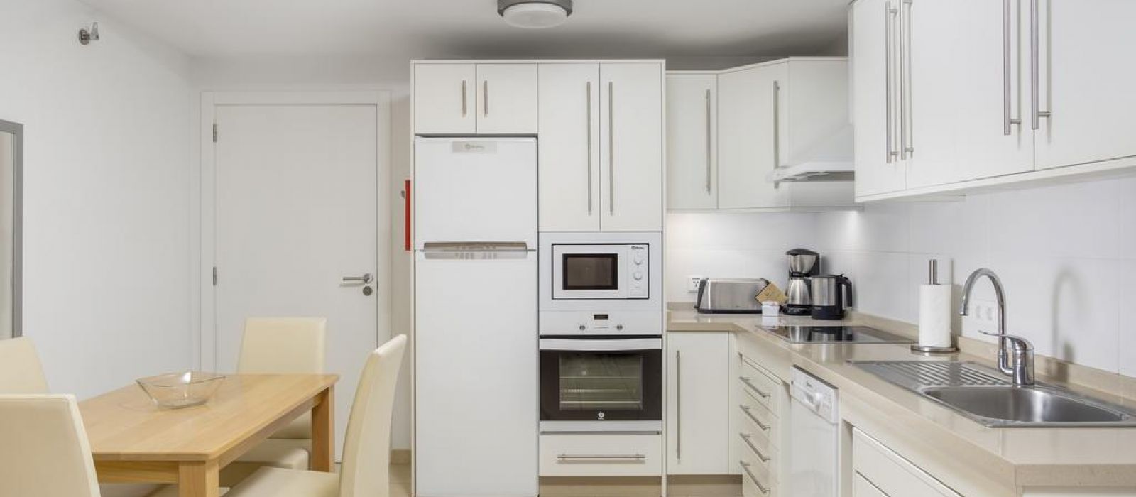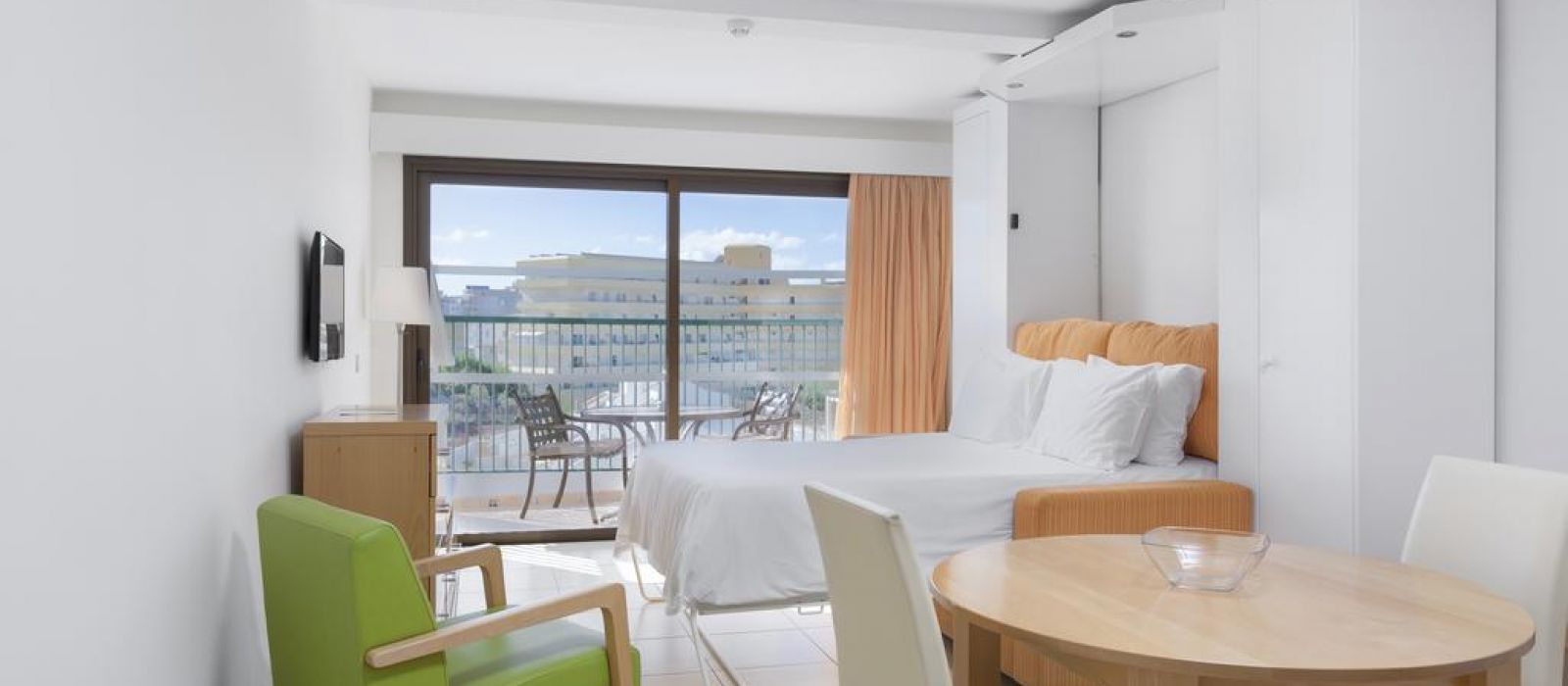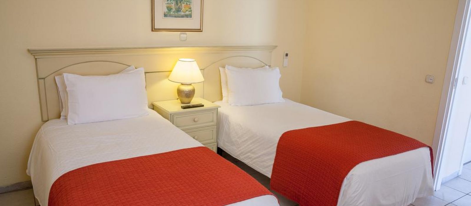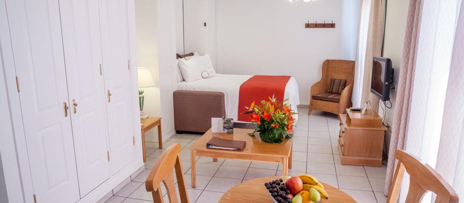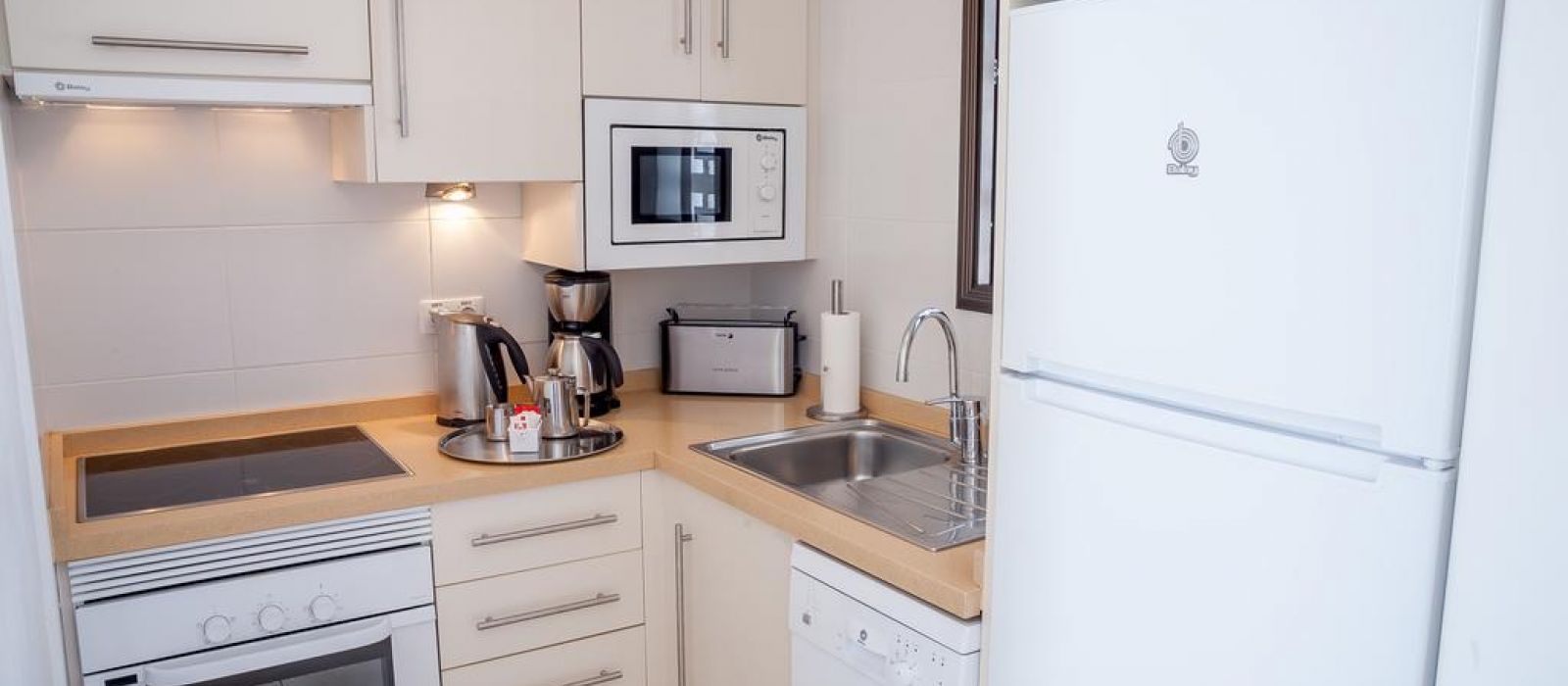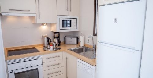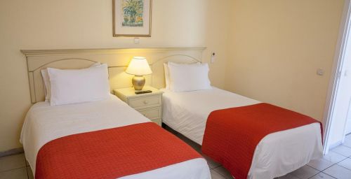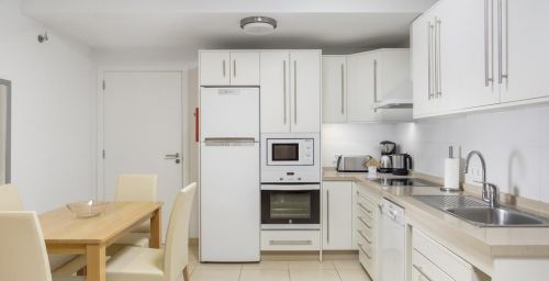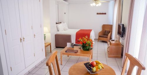 Les appartements du Sunset Bay Club disposent de carrelage au sol et d'un mobilier en bois. Leur cuisine est équipée de plaques de cuisson, d'un four et d'une cafetière. Tous les appartements possèdent également un balcon privé.