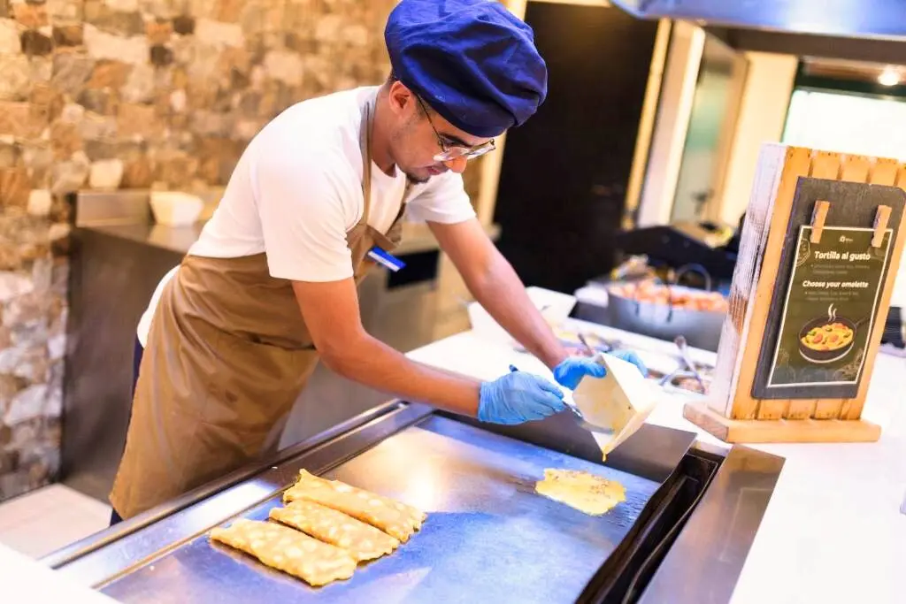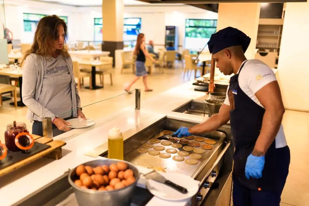L’établissement propose un restaurant buffet offrant une cuisine internationale et méditerranéenne variée, avec des produits frais et un espace de show-cooking. Des menus adaptés aux régimes végétariens ou sans gluten sont disponibles sur demande. Les clients peuvent opter pour la formule demi-pension, pension complète ou tout compris. Le bar-salon et le bar de la piscine offrent un cadre convivial pour profiter d’un cocktail ou d’une pause détente à tout moment de la journée.