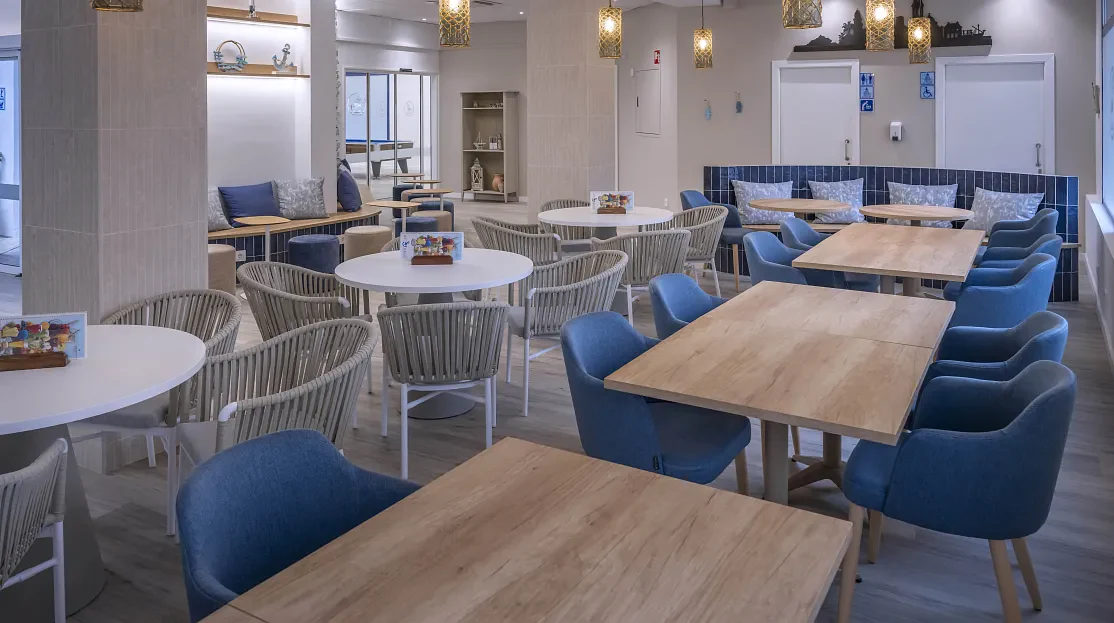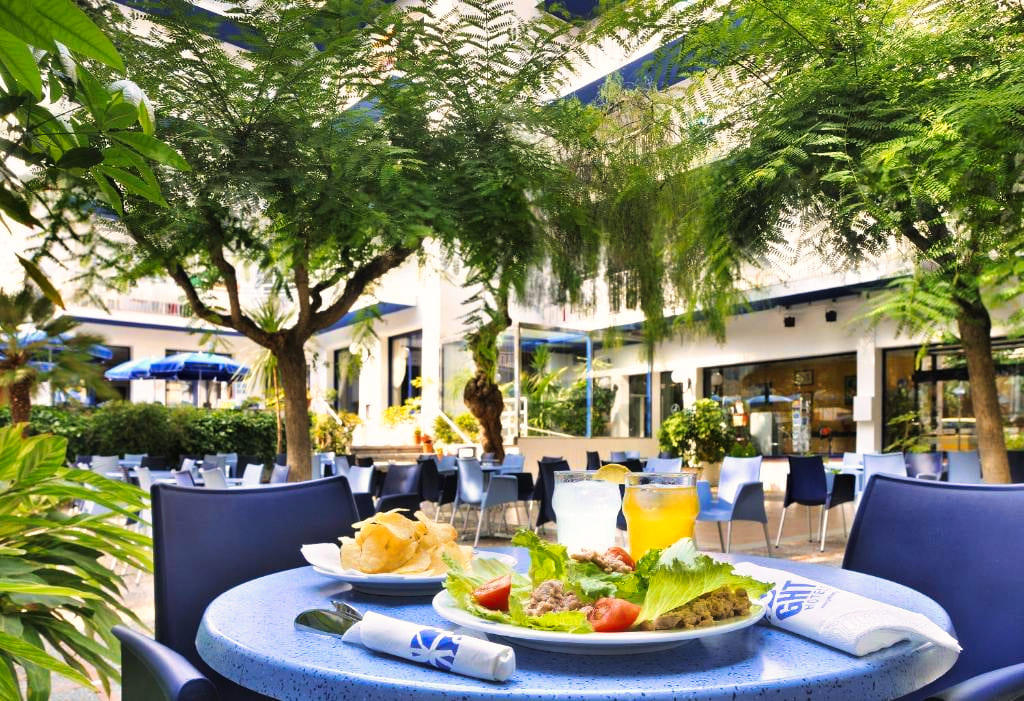Le restaurant propose une restauration sous forme de buffet, alliant cuisine internationale et saveurs méditerranéennes. Les plats sont variés et préparés avec des produits de qualité. Des options adaptées aux régimes particuliers, comme des alternatives végétariennes ou sans gluten, sont disponibles sur demande. Les formules proposées incluent le petit-déjeuner, la demi-pension et la pension complète. Le bar de l’hôtel offre également un espace convivial pour profiter d’un verre en terrasse.