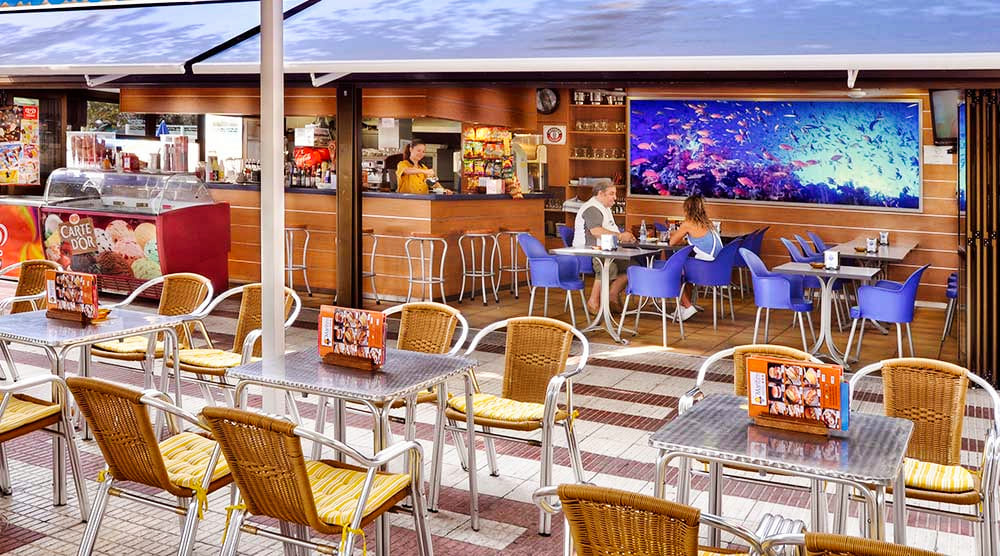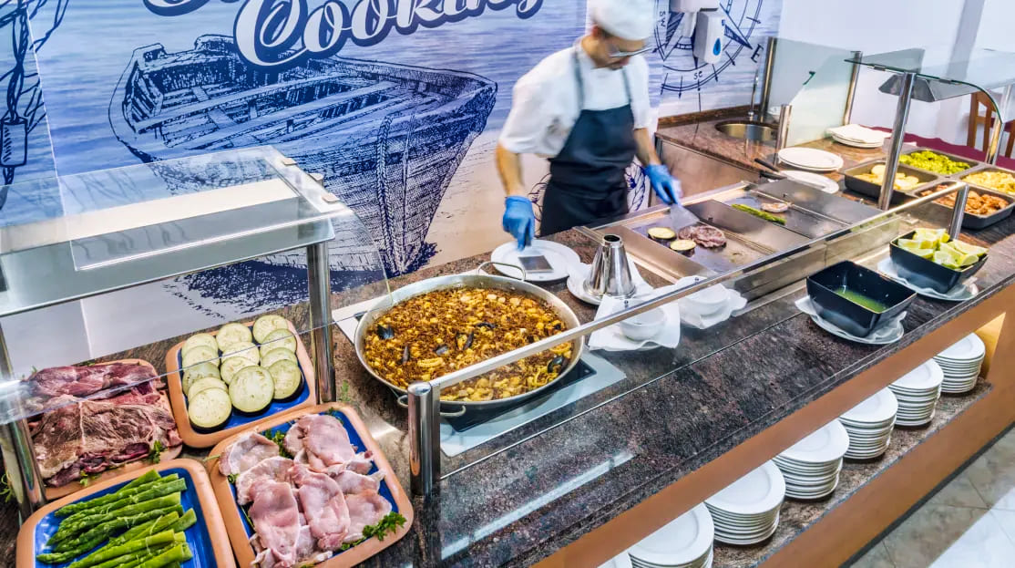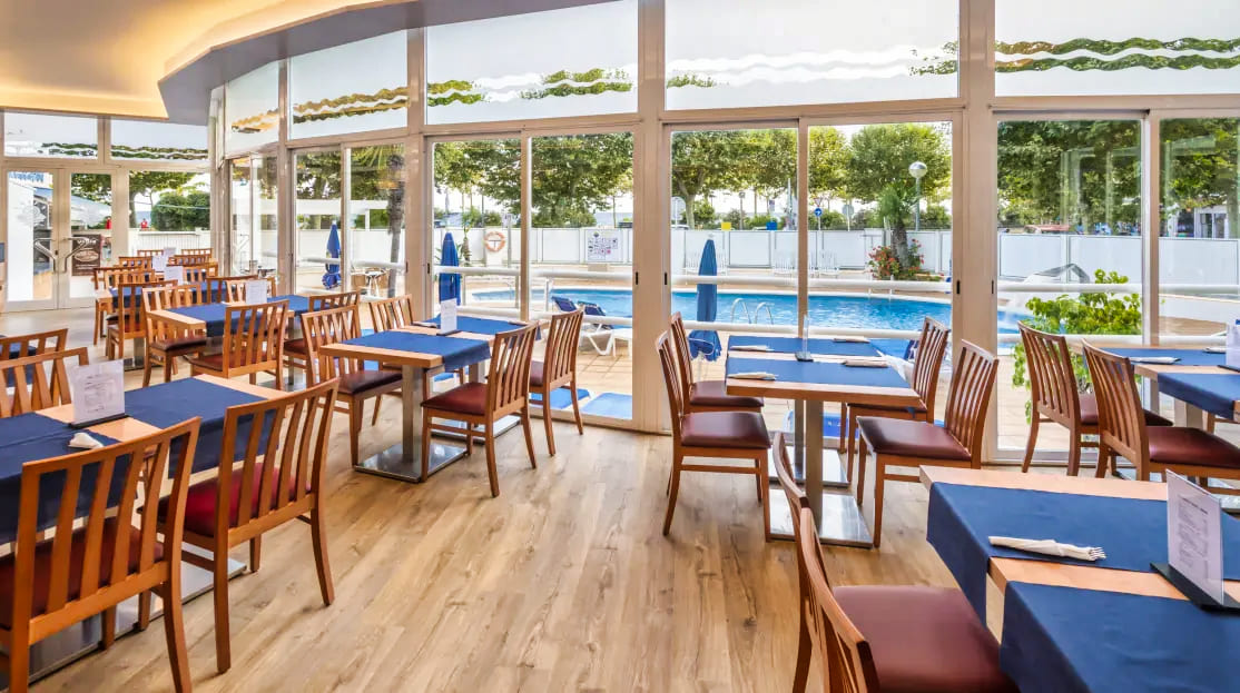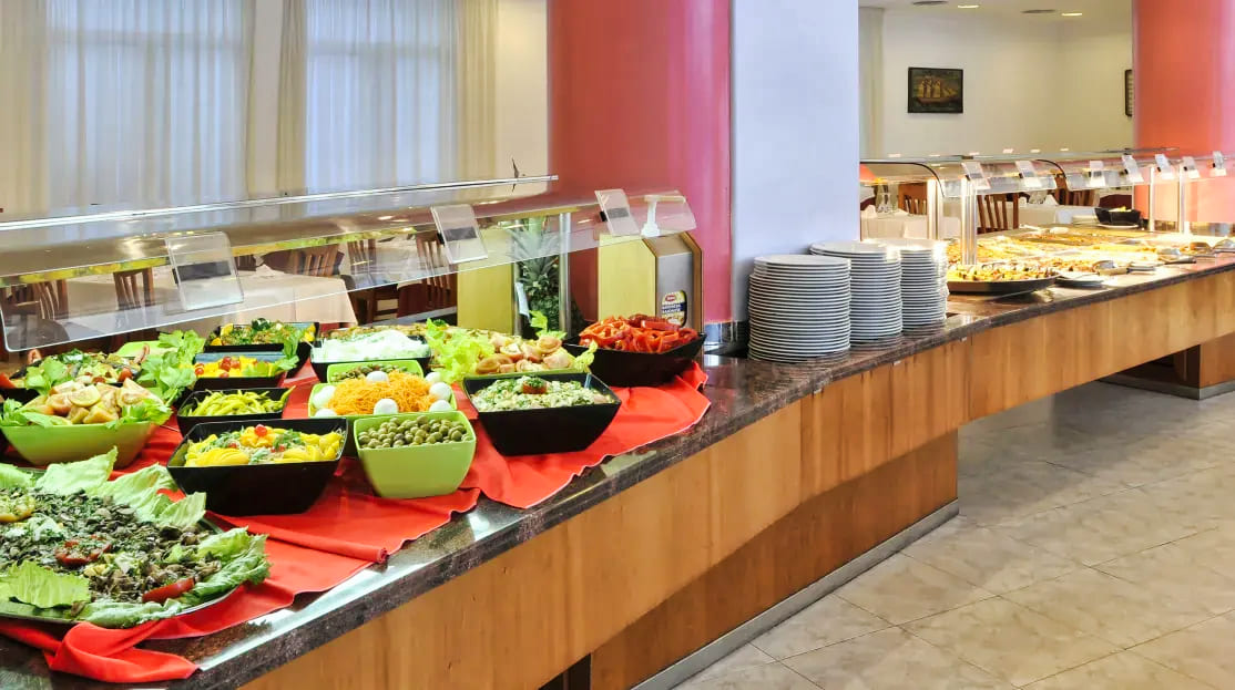 Le restaurant principal propose une restauration sous forme de buffet avec une large sélection de plats méditerranéens et internationaux. Les repas sont préparés à base de produits frais, et des options végétariennes et sans gluten sont disponibles sur demande. L’hôtel offre plusieurs formules au choix : petit-déjeuner, demi-pension ou pension complète. Un bar-salon et un snack-bar au bord de la piscine permettent de se détendre tout au long de la journée dans une ambiance conviviale.