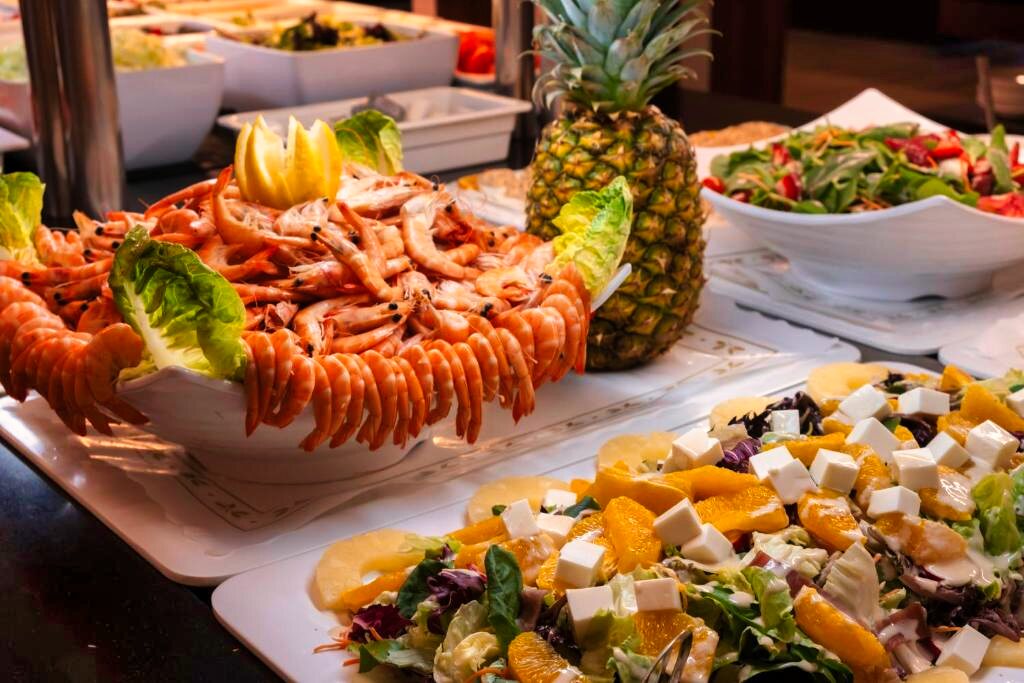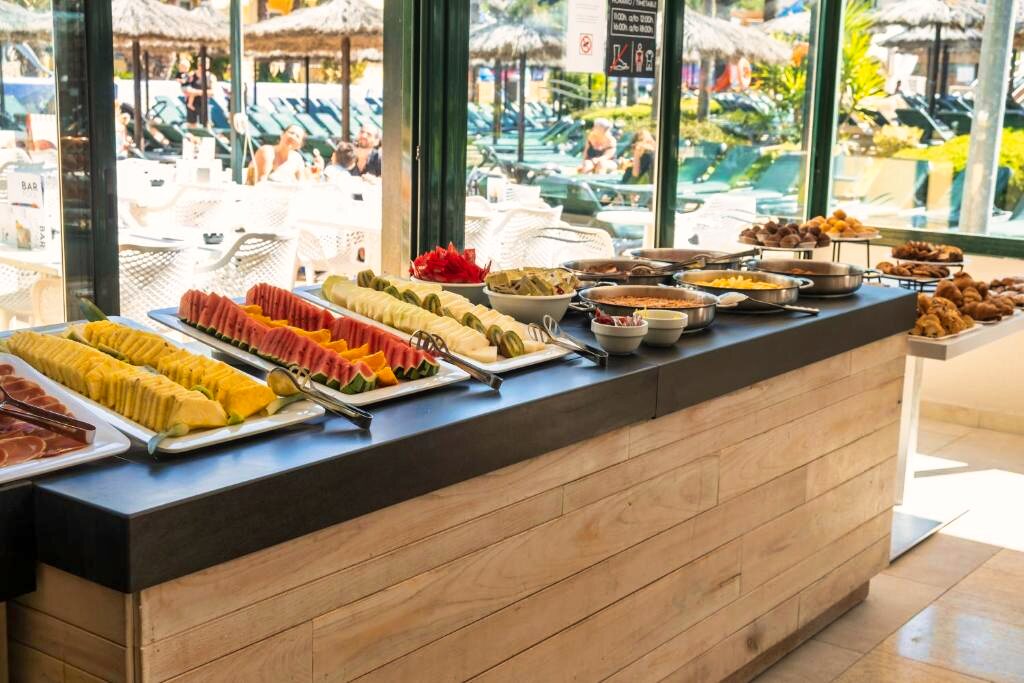 Le restaurant principal propose une cuisine méditerranéenne et internationale, servie sous forme de buffet avec show cooking et une large sélection de plats. Des options végétariennes et sans gluten sont disponibles sur demande. L’établissement propose les formules demi-pension, pension complète et tout compris. Plusieurs bars complètent l’offre pour profiter de moments de détente.