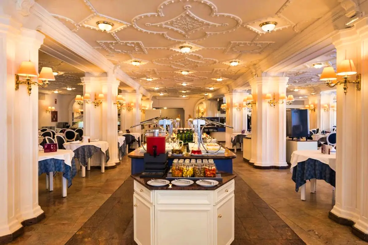Le restaurant principal de l’hôtel propose une cuisine méditerranéenne et internationale servie sous forme de buffet varié, mêlant produits frais, spécialités locales et plats internationaux. Le cadre est chaleureux et raffiné, parfait pour des repas en couple ou entre amis. Des plats adaptés aux régimes sans gluten ou végétariens peuvent être préparés sur demande. Selon la formule choisie, vous pourrez séjourner en demi-pension, pension complète ou tout compris.