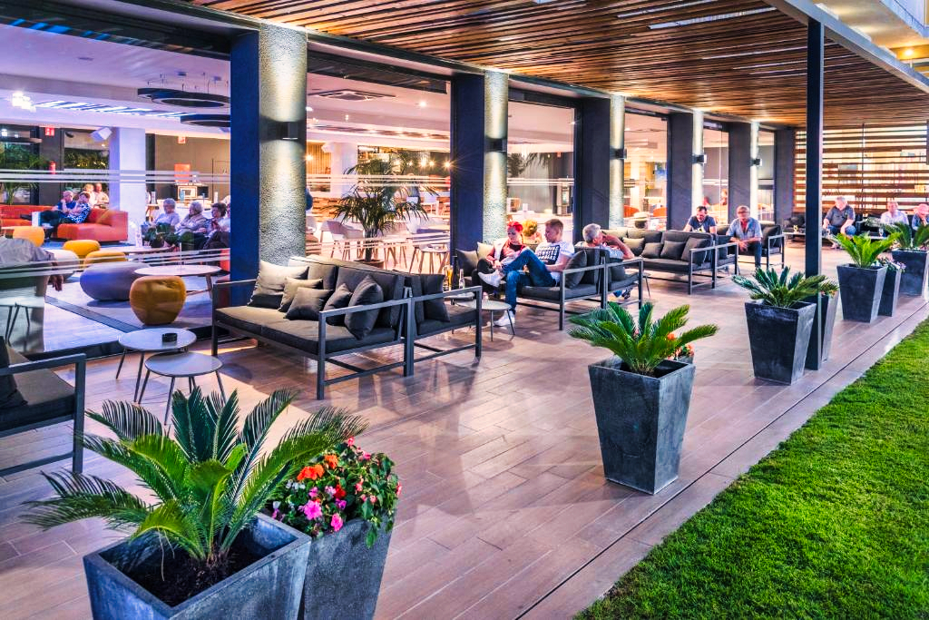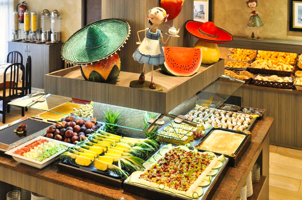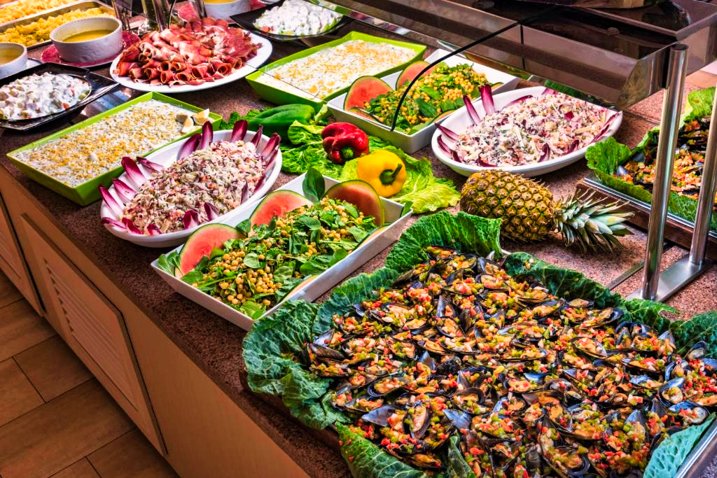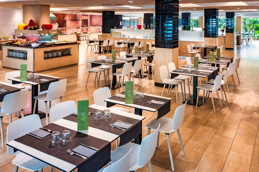 L’établissement propose un restaurant avec service de type buffet selon la saison et la formule choisie. La cuisine y est variée, mêlant spécialités locales et plats internationaux. Un bar intérieur, un bar en bord de piscine et un espace cafétéria sont également accessibles pour profiter de moments de détente tout au long de la journée.